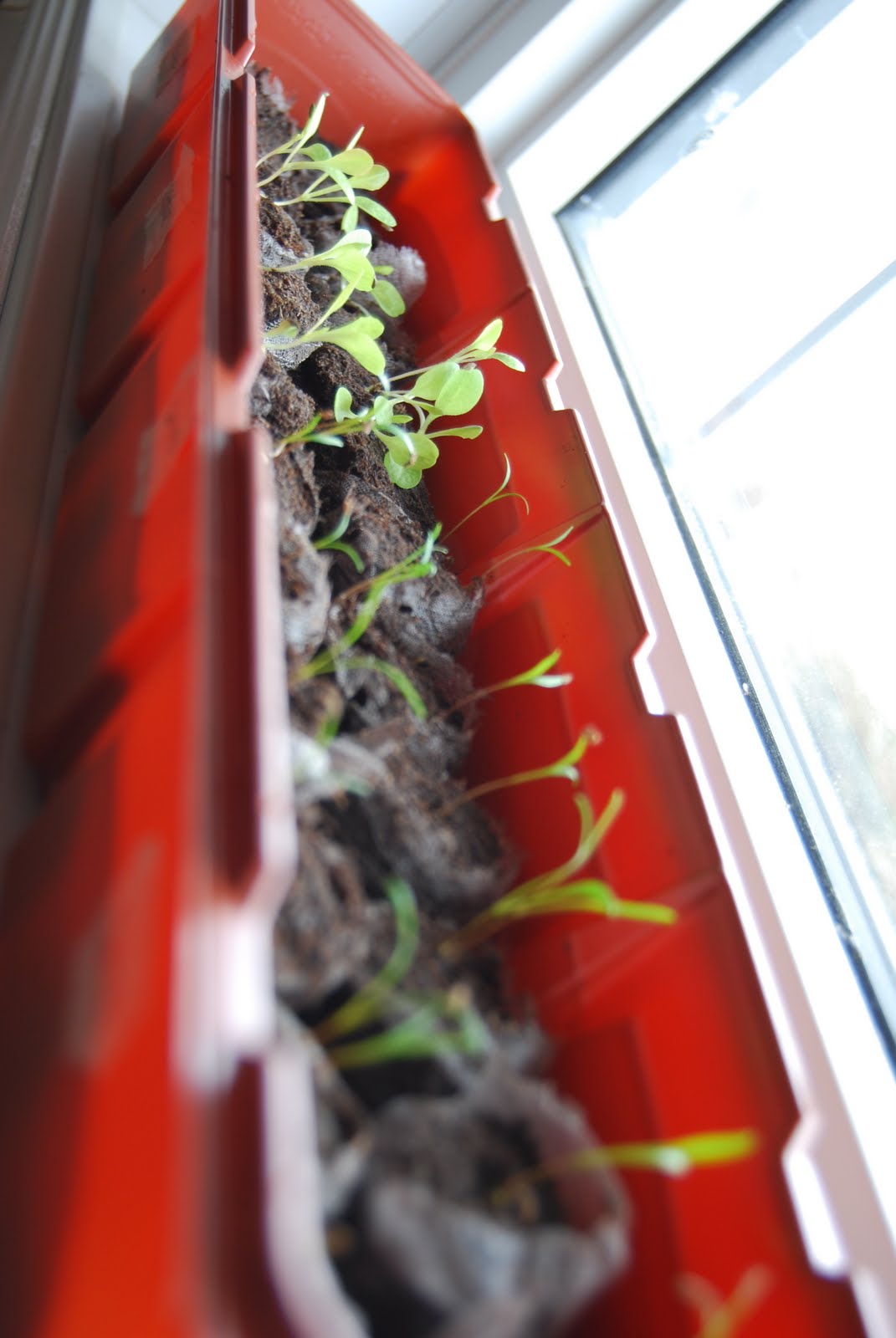 and as for today's theme: home gardening! my pictures for today are of the plants i have started on the basement window ledge. it might be too early for this.. but i couldn't wait to get my hands on some dirt. here they are: (it's vegetables in the long boxes and herbs in the small pots)